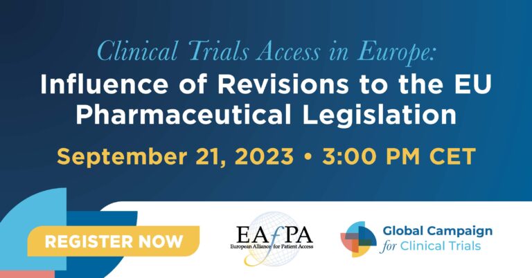 The European Alliance for Patient Access will host a webinar from the Global Campaign for Clinical Trials on September 21 at 3pm CET to explore the impact of the recent revisions of the EU pharmaceutical legislation on clinical trials and its impact on patient access.
